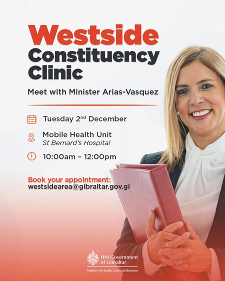 The Minister for Health, Care and Business, and Constituency MP for the Westside Area, the Hon Gemma Arias-Vasquez, will be holding her next constituency clinic on Tuesday 2nd December from 10am to 12pm at the Mobile Health Unit stationed outside St Bernard’s Hospital.