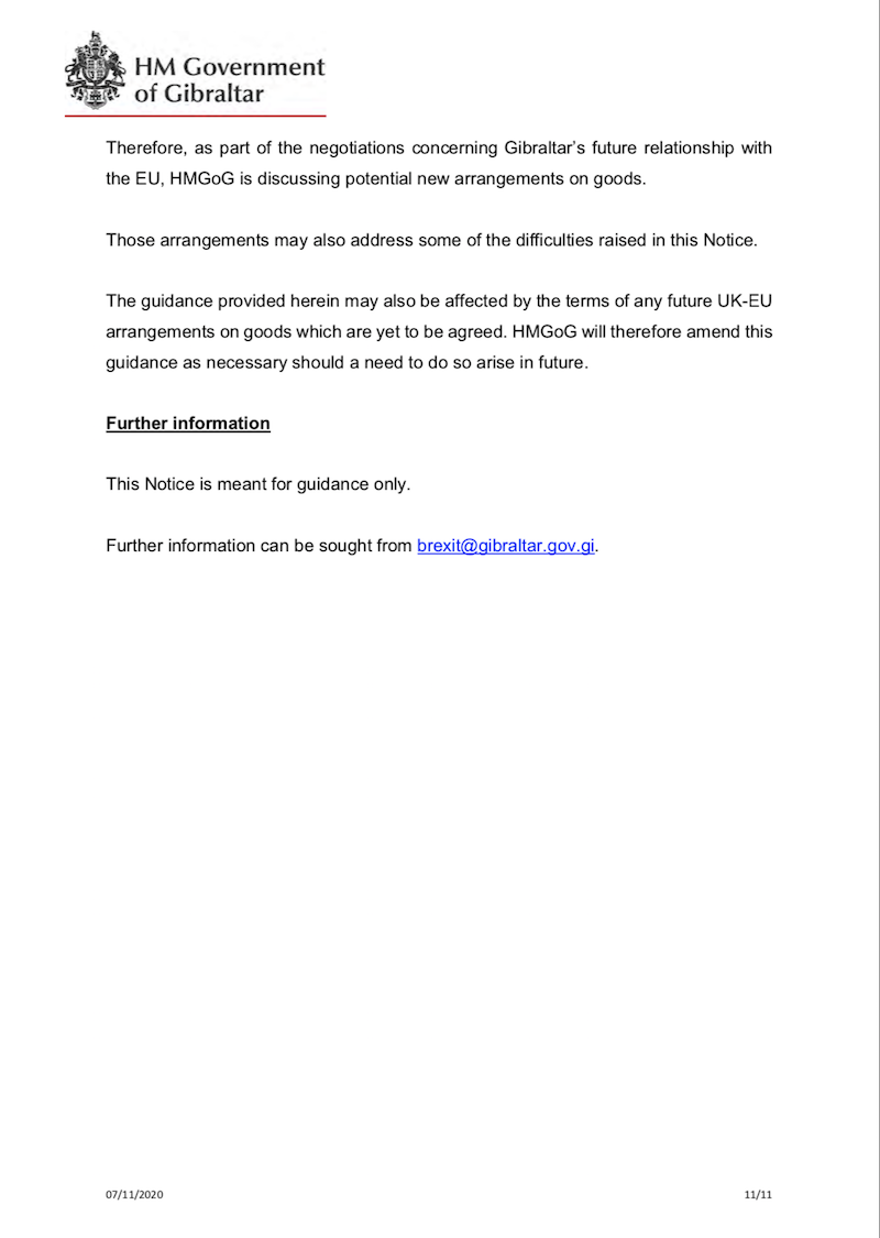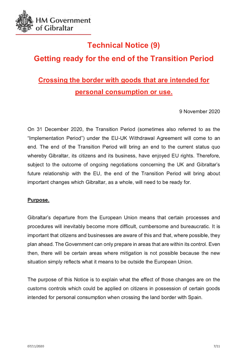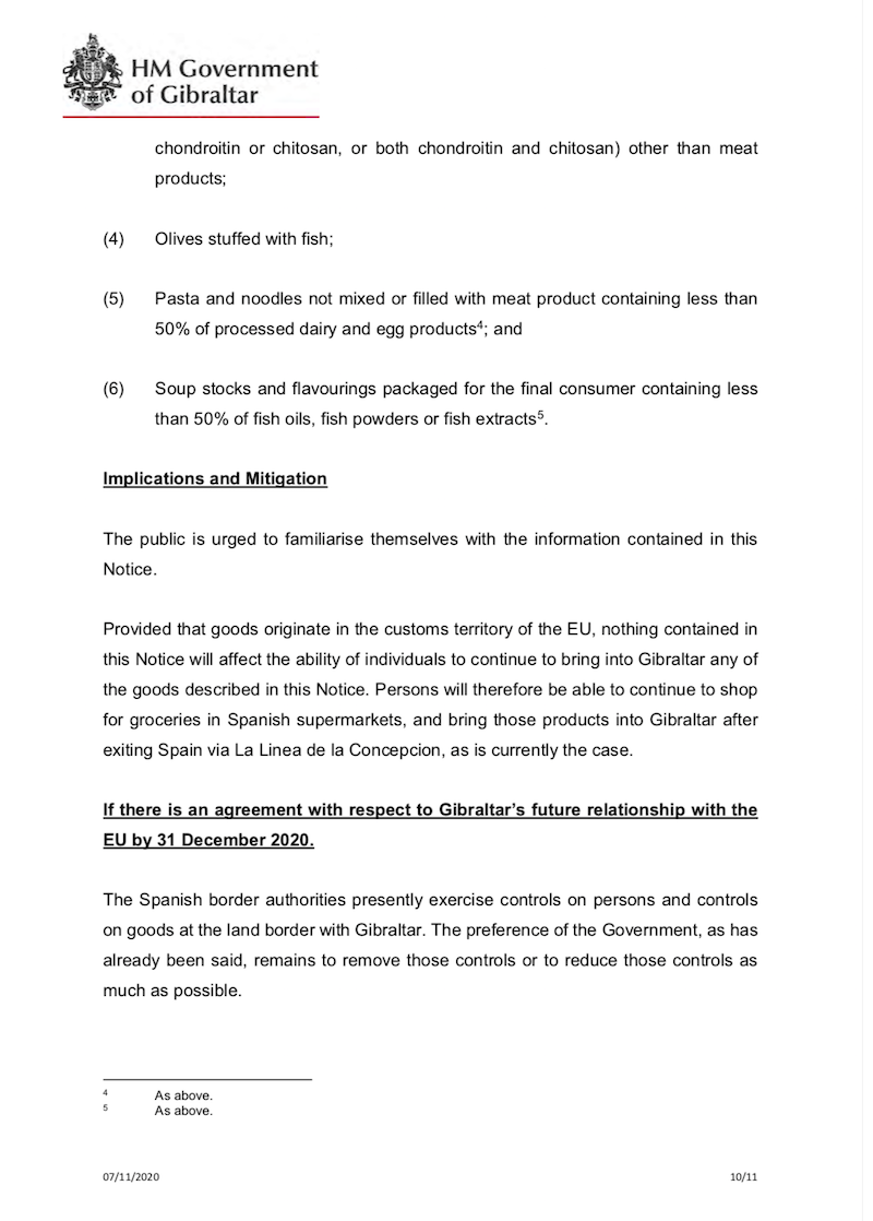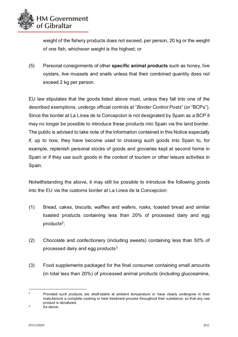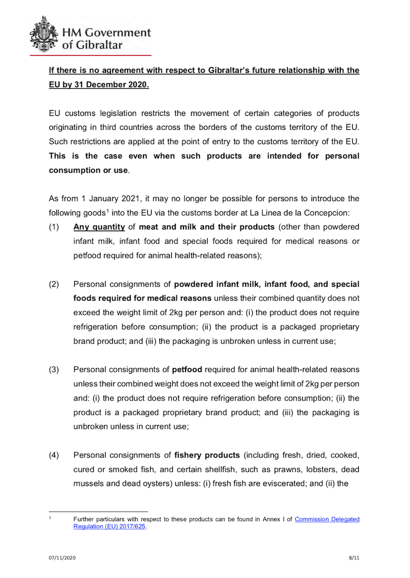 In the event of no agreement on the future relationship between Gibraltar and the European Union, it will no longer be possible to take certain types of foodstuffs across the border from Gibraltar to Spain.