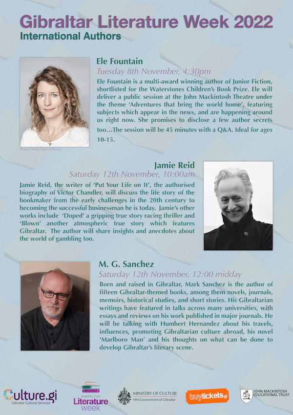 Mark Sanchez, Ele Fountain, and Jamie Reid are three of this year’s overseas contributors. In its 3rd edition, the event organised by Gibraltar Cultural Services on behalf of the Ministry of Culture and sponsored by the John Mackintosh Educational Trust, will run between the 7th and 12th November 2022 and will see a jam-packed programme featuring many local authors and a variety of initiatives and events.