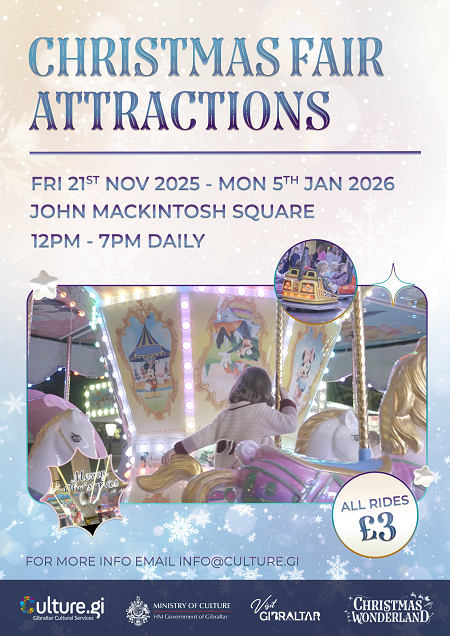 Gibraltar Cultural Services (GCS), on behalf of the Ministry of Culture, is pleased to announce the Christmas Fair attractions, particularly popular amongst the young members of our community, will once again feature throughout the festive Christmas period.
