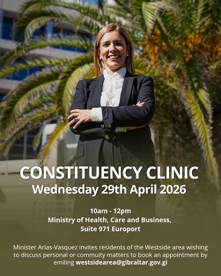 The Minister for Health, Care and Business, and Constituency MP for the Westside Area, the Hon Gemma Arias-Vasquez, will be holding her next constituency clinic on Wednesday 29th April 2026 from 10am to 12pm at the Ministry for Health, Care and Business, Suite 971, Europort.